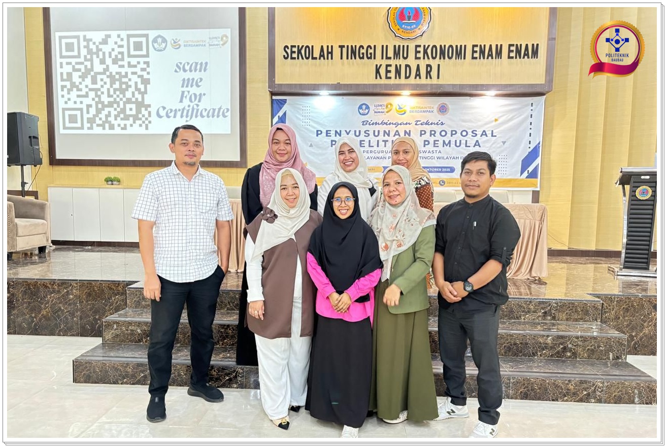Kendari, 27–28 Oktober 2025 — Sejumlah dosen Politeknik Baubau mengikuti kegiatan Bimbingan Teknis (Bimtek) Penyusunan Proposal Penelitian Pemula yang diselenggarakan oleh Lembaga Layanan Pendidikan Tinggi (LLDIKTI) Wilayah IX. Kegiatan ini berlangsung selama dua hari di Sekolah Tinggi Ilmu Ekonomi (STIE) Enam-Enam Kendari.