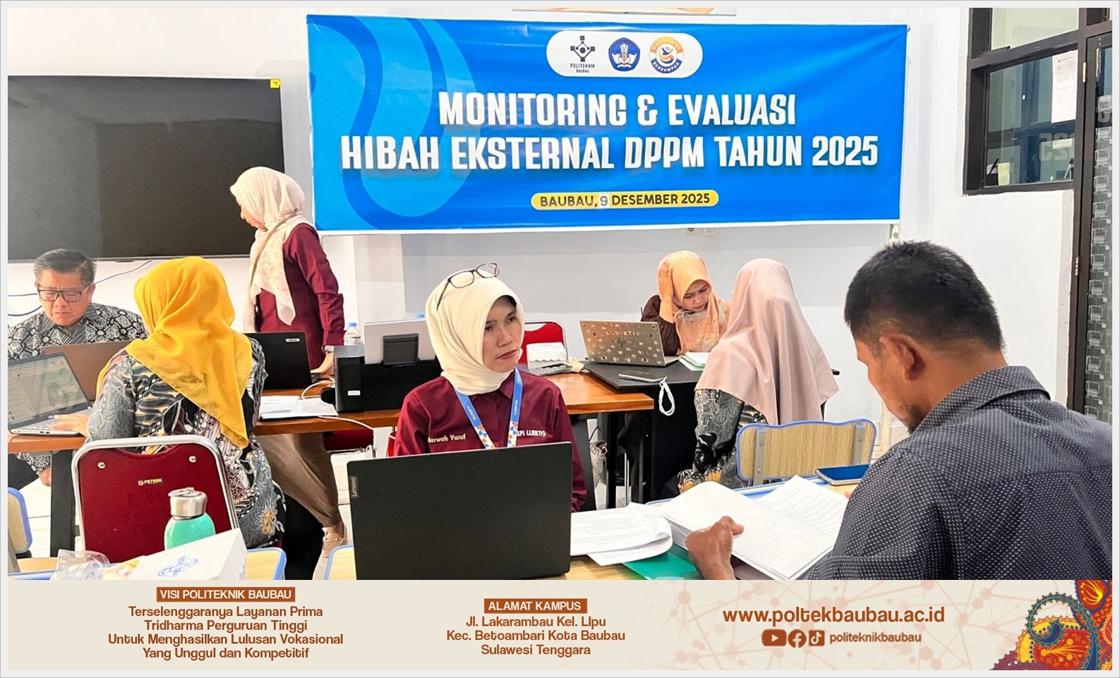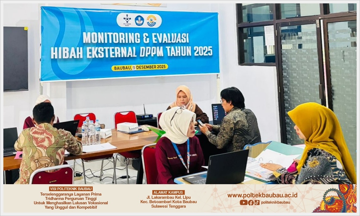 Monitoring dan Evaluasi (Monev) Hibah Eksternal Direktorat Penelitian dan Pengabdian kepada Masyarakat Tahun 2025 resmi dilaksanakan di Politeknik Baubau pada tanggal 9 Desember 2025. Kegiatan ini merupakan agenda penting untuk memastikan pelaksanaan penelitian dan pengabdian kepada masyarakat berjalan efektif, tepat sasaran, dan sesuai dengan ketentuan yang ditetapkan oleh Direktorat Riset.