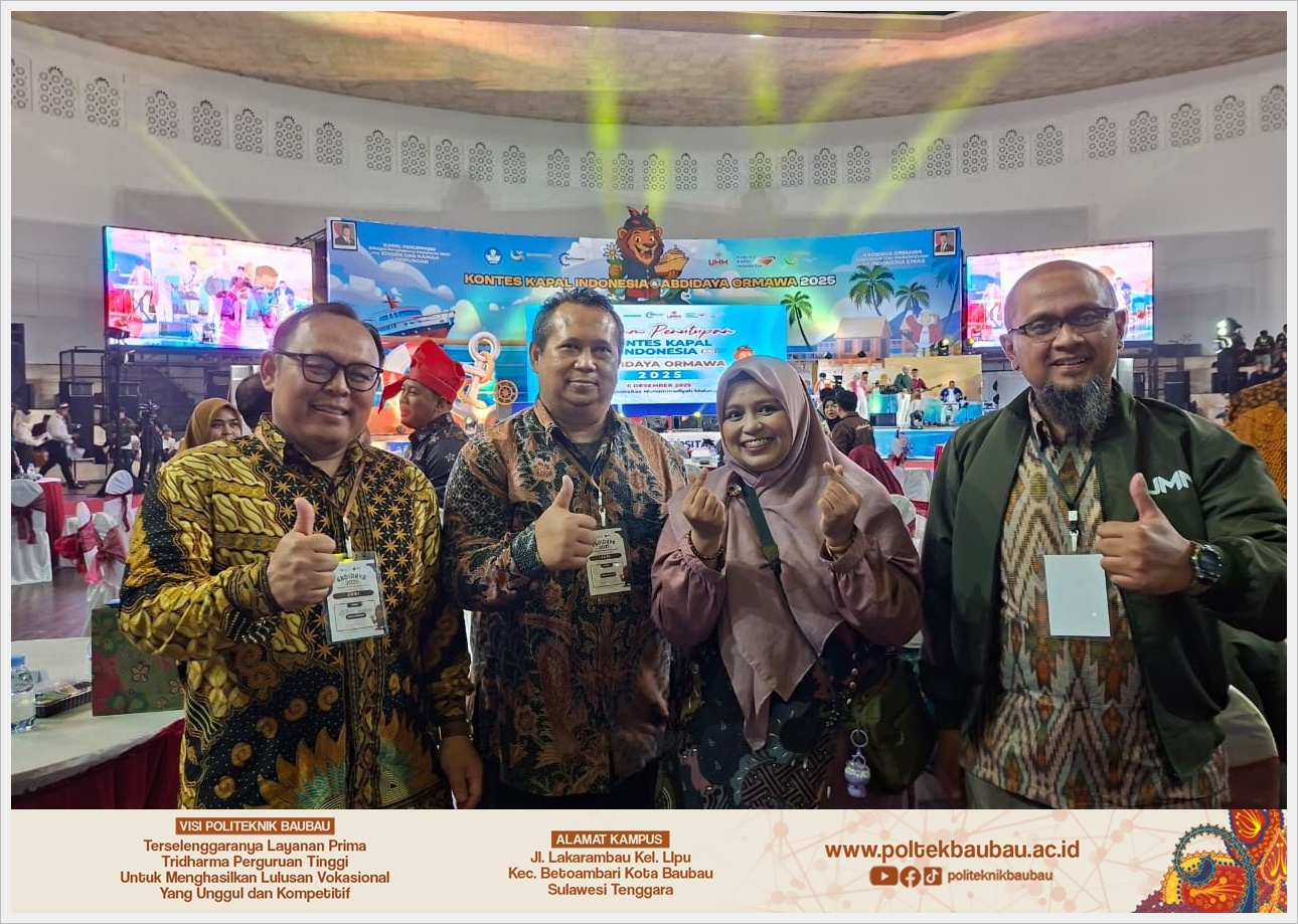 Semarang - Ajang Abdidaya Ormawa 2025 yang berlangsung pada 4–6 Desember 2025 di Universitas Muhammadiyah Semarang menjadi momen membanggakan bagi Politeknik Baubau. Pada kegiatan berskala nasional tersebut, tim Program Penguatan Kapasitas (PPK) Ormawa Politeknik Baubau berhasil meraih Penghargaan Terbaik Pertama untuk kategori Video Paling Langka melalui karya dokumentasi bertema Gerakan Kemiri Mandiri Desa Kaongkeongkea.