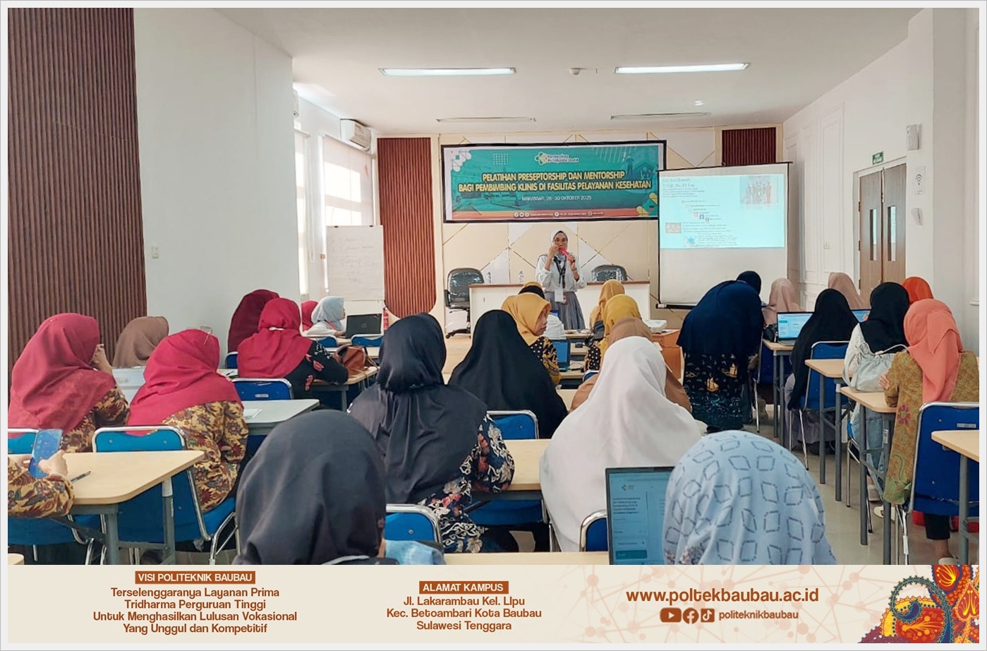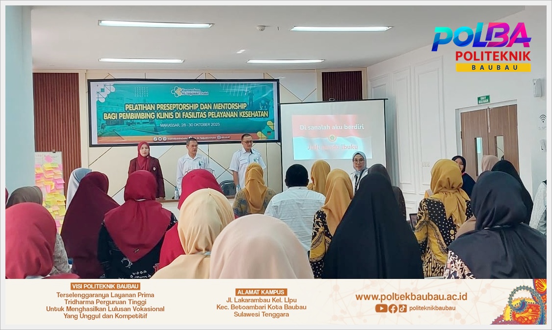Pelatihan Preseptorship dan Mentorship bagi Pembimbing Klinis kembali digelar sebagai upaya meningkatkan kualitas pembimbingan klinis di fasilitas kesehatan. Kegiatan ini berlangsung di RSUP Dr. Tadjuddin Chalid Makassar pada tanggal 28–30 Oktober 2025 dan menghadirkan peserta dari berbagai institusi kesehatan, termasuk Politeknik Baubau. Pelatihan ini menjadi wadah penting bagi tenaga kesehatan untuk memperkuat kompetensi dalam membimbing praktikan maupun tenaga kesehatan baru di lapangan.