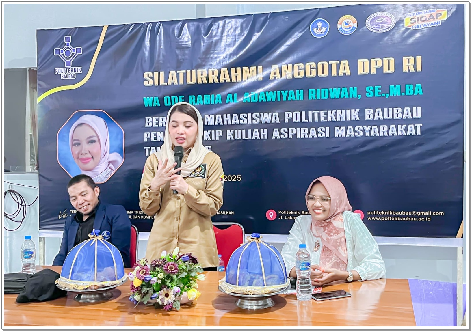 Baubau — Politeknik Baubau menjadi tuan rumah kegiatan Silaturahmi Anggota DPD RI, Wa Ode Rabia Al Adawiyah Ridwan, SE., M.B.A. bersama Mahasiswa Penerima KIP Kuliah Aspirasi Masyarakat, yang dilaksanakan pada Sabtu, 18 Oktober 2025. Acara ini dihadiri langsung oleh pimpinan Politeknik Baubau, dosen, serta mahasiswa penerima program Kartu Indonesia Pintar (KIP) Kuliah Aspirasi Masyarakat.