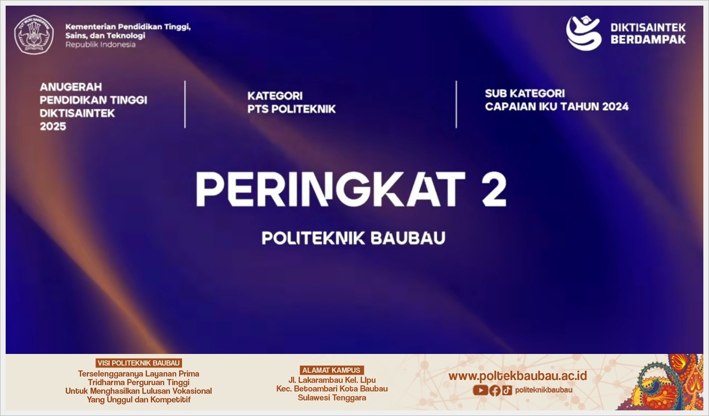 Politeknik Baubau kembali menorehkan prestasi membanggakan di tingkat nasional. Pada Acara Anugerah Pendidikan Tinggi Kementerian Pendidikan Tinggi, Sains, dan Teknologi Republik Indonesia Tahun 2025, Politeknik Baubau berhasil meraih peringkat kedua kategori Perguruan Tinggi Swasta (PTS) Politeknik subkategori Capaian Indikator Kinerja Utama (IKU) Tahun 2024.