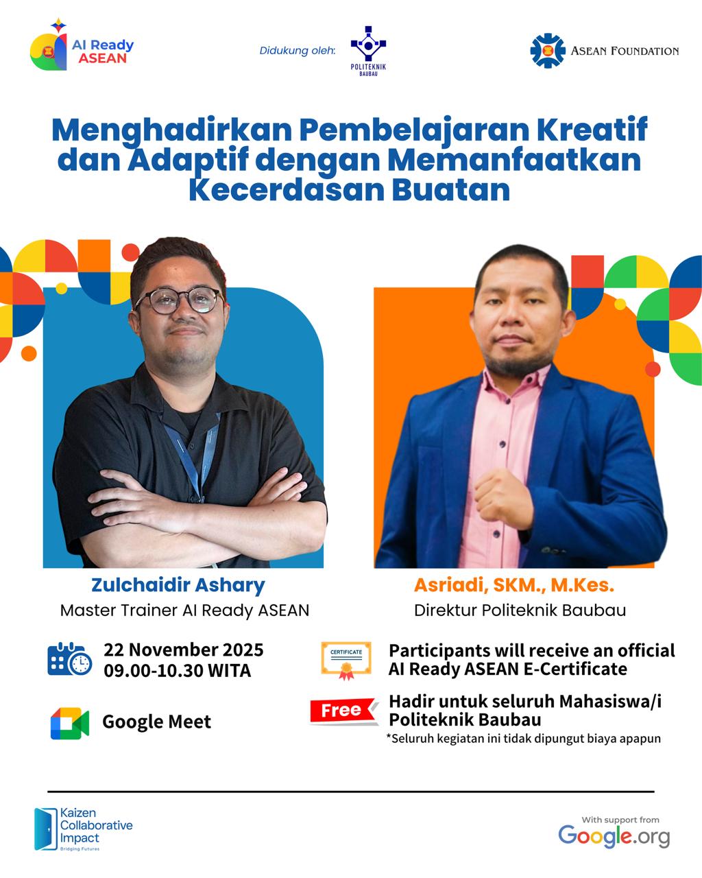 Politeknik Baubau bersama AI Ready ASEAN dan ASEAN Foundation menggelar sesi sharing inspiratif tentang bagaimana AI dapat dimanfaatkan dalam proses pembelajaran yang lebih inovatif dan adaptif.