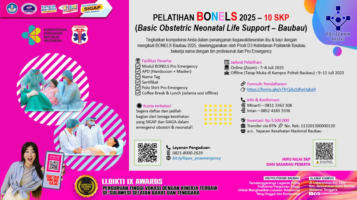 Tingkatkan kompetensi Anda dalam penanganan kegawatdaruratan ibu & bayi dengan mengikuti BONELS Baubau 2025, diselenggarakan oleh **Prodi D3 Kebidanan Politeknik Baubau bekerja sama dengan tim profesional dari Pro Emergency! 🚑👶👩⚕