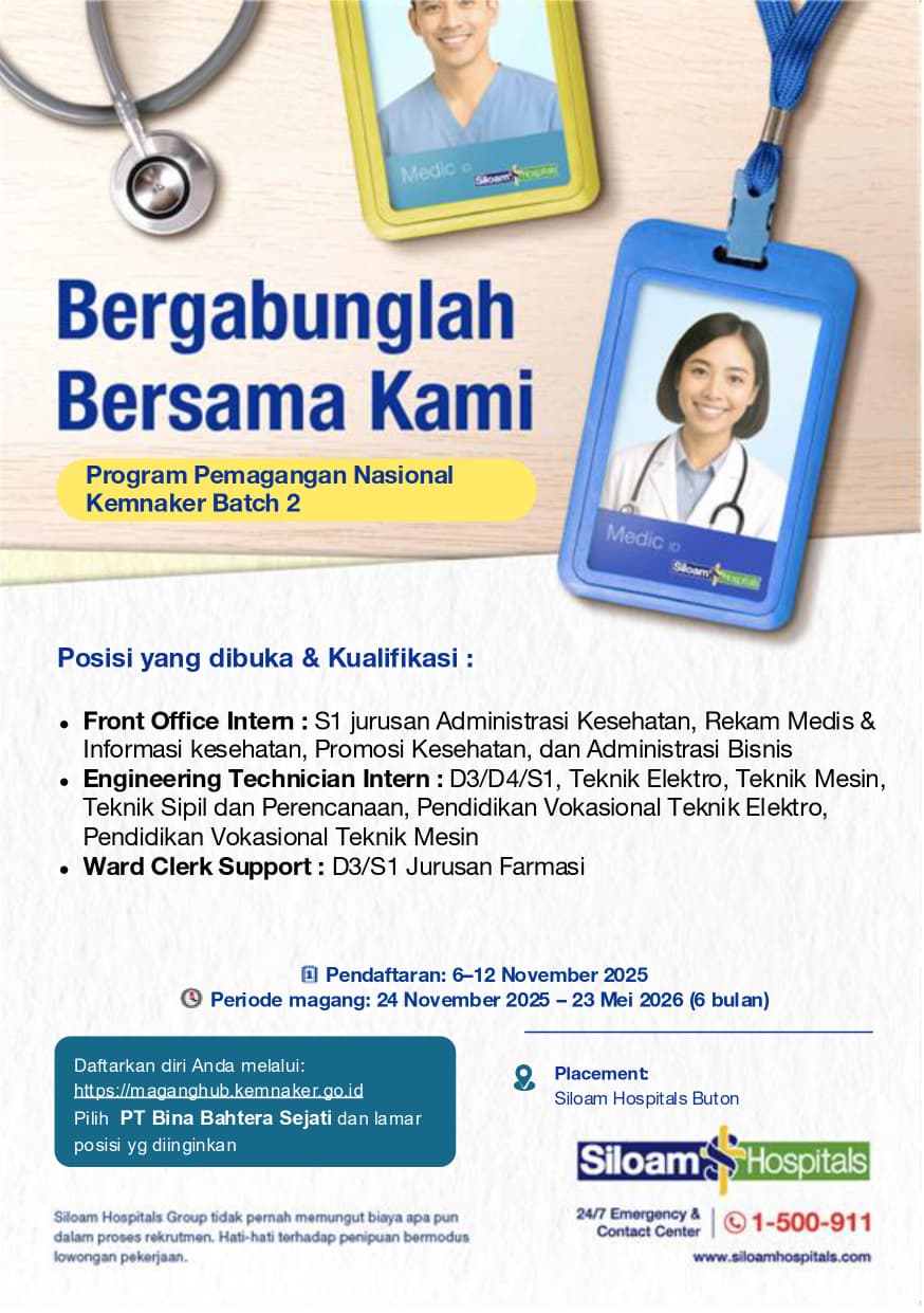 ⚠ Siloam Hospitals Group tidak pernah memungut biaya apa pun dalam proses rekrutmen. Hati-hati terhadap penipuan berkedok lowongan pekerjaan.